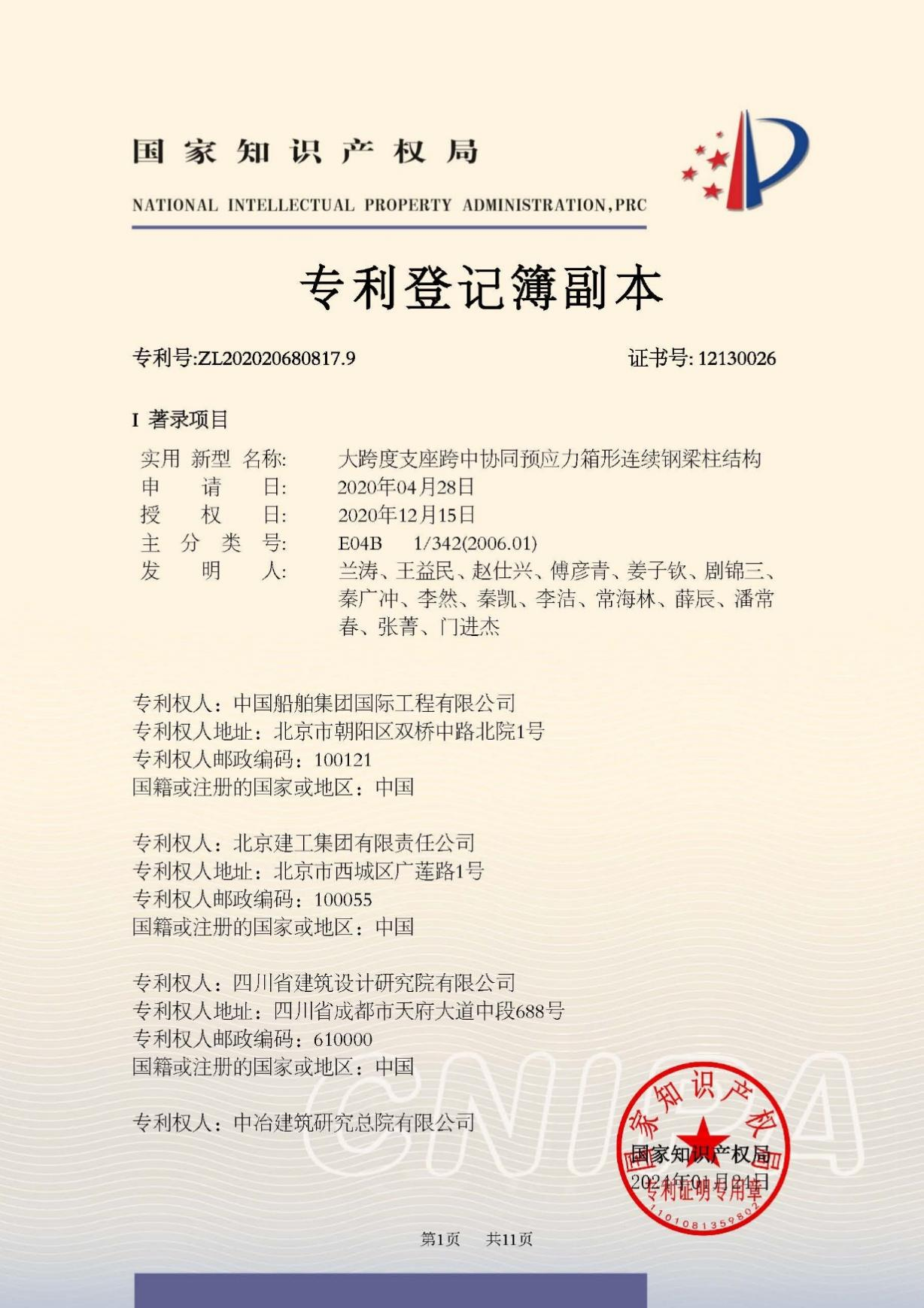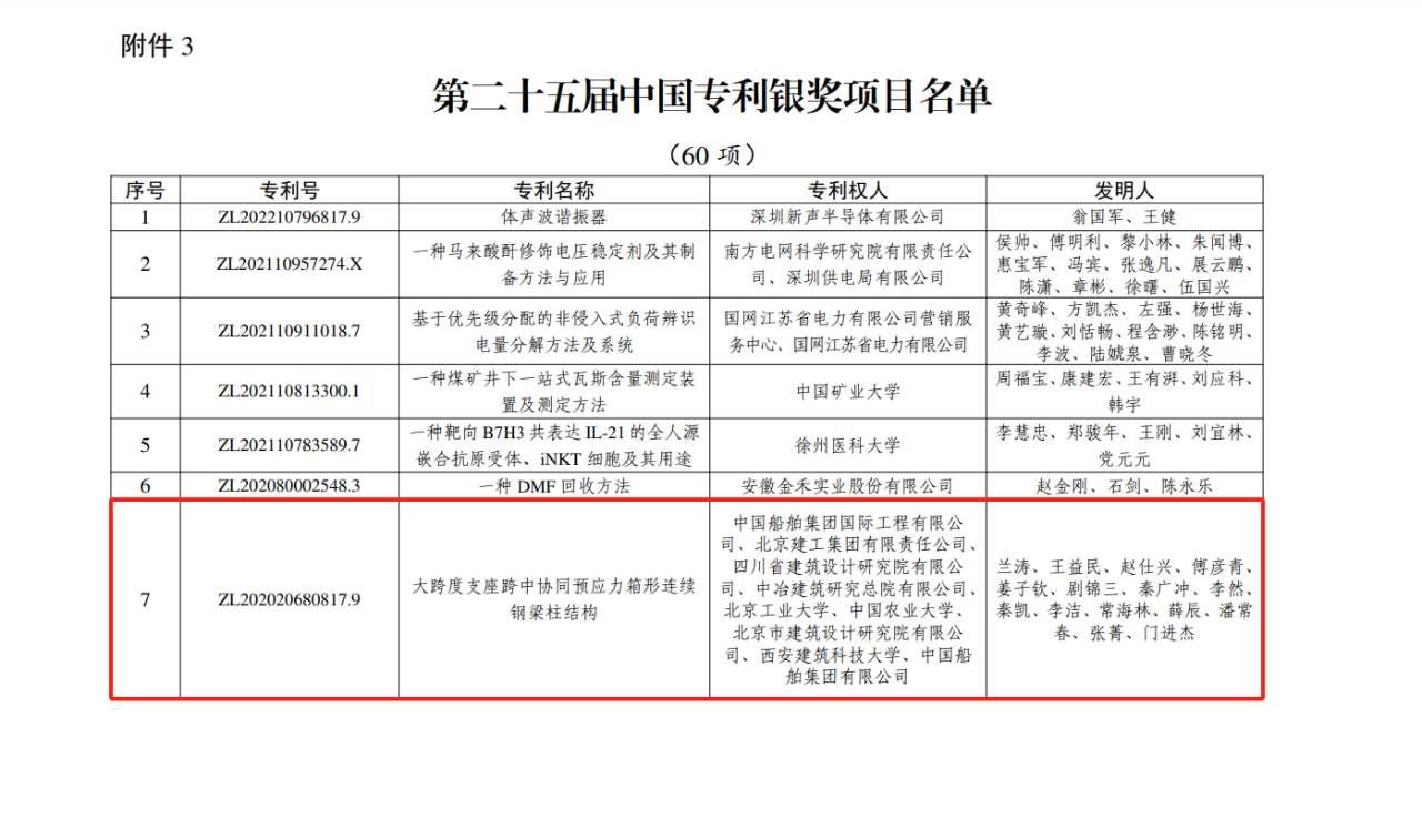 今年6月,國家知識產(chǎn)權(quán)局公布第二十五屆中國專利獎授獎決定,由中船集團旗下中船國際工程主導申報的專利《大跨度支座跨中協(xié)同預應力箱形連續(xù)鋼梁柱結(jié)構(gòu)》(專利號:ZL202020680817.9)榮獲本屆中國專利銀獎。該獎項由國家知識產(chǎn)權(quán)局與世界知識產(chǎn)權(quán)組織聯(lián)合設(shè)立,是我國專利領(lǐng)域的最高榮譽。今天,讓我們走進中船國際工程鋼結(jié)構(gòu)工程設(shè)計與研發(fā)團隊,聆聽他們的奮斗故事。