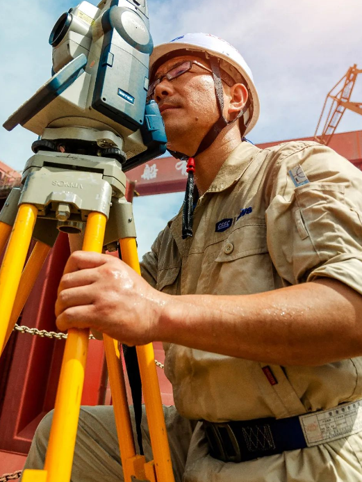 近40度的高溫天氣下,一位造船精度人堅守崗位,使用全站儀監(jiān)控船塢每個搭載總段的定位精度,保障一次搭載到位。