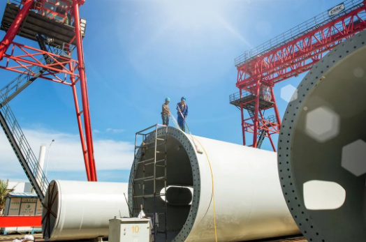 七月,在中國海裝大連莊河項目中,火熱的盛夏配上火熱的搶裝,運維人員正在對24號機組做底段塔筒安裝前的準備工作。