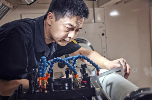 七〇八所海迅公司生產(chǎn)部的員工計師傅雖已汗如雨下,仍專注于銑床加工之中。