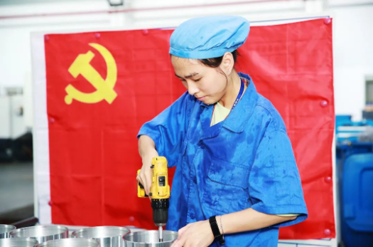 七二六所車間,在黨旗的輝映下,機加工車間,鉗床組張師傅正在緊張地加工零件和毛刺修整,早已顧不上汗水的洗禮。