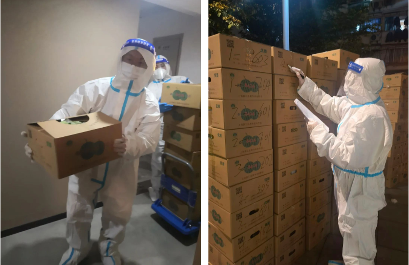 由于防護服有限,居住在黃浦區(qū)某社區(qū)的集團職工中只有鄭珂成了志愿者,只見他時而忙著卸貨分裝,時而忙著打包標記,7棟樓近400戶居民共計幾百公斤的物資,都由他一人完成了分裝和標記工作。在他服務(wù)的對象中,既有身在涉疫樓棟無法出戶的同事,也有素未謀面的鄰居。