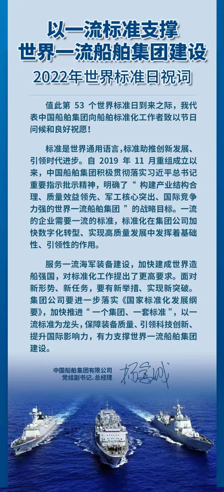 10月14日,中國船舶集團(tuán)舉行第53屆世界標(biāo)準(zhǔn)日主題活動,主題為“以一流標(biāo)準(zhǔn)支撐世界一流船舶集團(tuán)建設(shè)”
