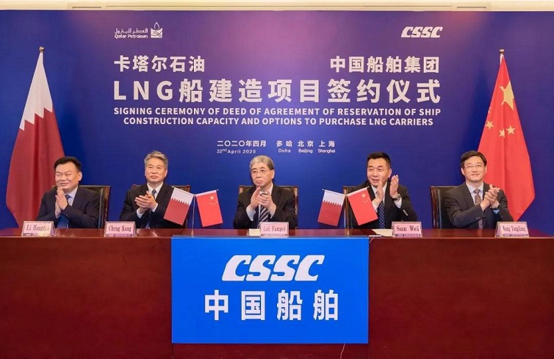 ????4月22日,中國(guó)船舶集團(tuán)與卡塔爾石油公司在中國(guó)北京、上海及卡塔爾多哈三地以“云簽約”方式聯(lián)合簽署“中國(guó)船舶—卡塔爾石油液化天然氣(LNG)船建造項(xiàng)目”協(xié)議,所涉訂單總金額超過(guò)200億元人民幣。這是卡塔爾天然氣項(xiàng)目首批訂單,也是中國(guó)船企迄今承接的金額最大的造船出口訂單。中國(guó)船舶集團(tuán)和卡塔爾石油將強(qiáng)強(qiáng)聯(lián)手,依托各自優(yōu)勢(shì)在能源運(yùn)輸、裝備制造及全球化服務(wù)等領(lǐng)域開(kāi)展廣泛合作。