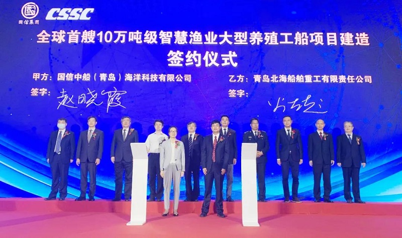 ????6月3日,中國船舶集團(tuán)有限公司旗下武船集團(tuán)青島北海船舶重工有限責(zé)任公司與國信中船(青島)海洋科技有限公司在青島西海新區(qū)正式簽署全球首艘10萬噸級智慧漁業(yè)大型養(yǎng)殖工船的建造合同。本次簽約標(biāo)志著養(yǎng)殖工船項目正式進(jìn)入實質(zhì)性建造階段,該船將于2022年3月交付。中國船舶集團(tuán)黨組成員、副總經(jīng)理孫偉,青島市副市長耿濤等領(lǐng)導(dǎo)和嘉賓出席簽約儀式。