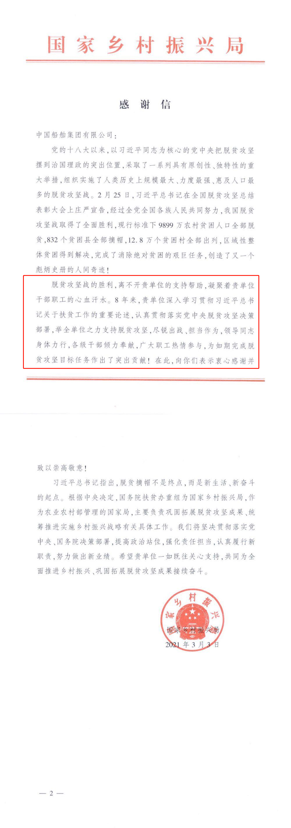 日前,中國(guó)船舶集團(tuán)收到一封特殊的感謝信。信中對(duì)中國(guó)船舶集團(tuán)8年來的擔(dān)當(dāng)作為、傾情奉獻(xiàn)表示感謝和敬意,這封信來自不久前剛剛掛牌的國(guó)家鄉(xiāng)村振興局。