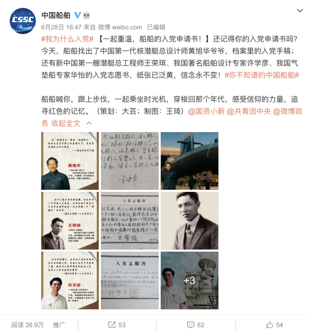 這篇微博展示了中國(guó)第一代核潛艇總設(shè)計(jì)師黃旭華、新中國(guó)第一艘潛艇總工程師王榮瑸、我國(guó)著名船舶設(shè)計(jì)專家許學(xué)彥、我國(guó)氣墊船專家華怡的親筆入黨志愿書(shū),用一種時(shí)空穿越的方式,追尋一代人的紅色記憶,用船舶人的方式,慶祝建黨百年。