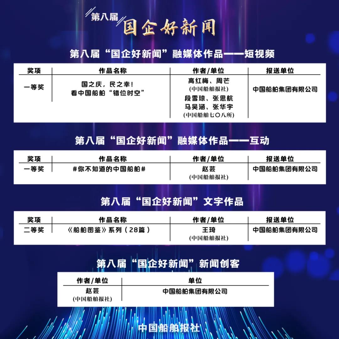 1月11日,第八屆“國企好新聞”獲獎作品正式揭曉,中國船舶集團(tuán)斬獲4項(xiàng)大獎,涵蓋系列報(bào)道、短視頻、融媒體作品等多種體裁。其中,一等獎2項(xiàng)、二等獎1項(xiàng),并首次榮膺十大新聞創(chuàng)客獎,獲獎名單如下: