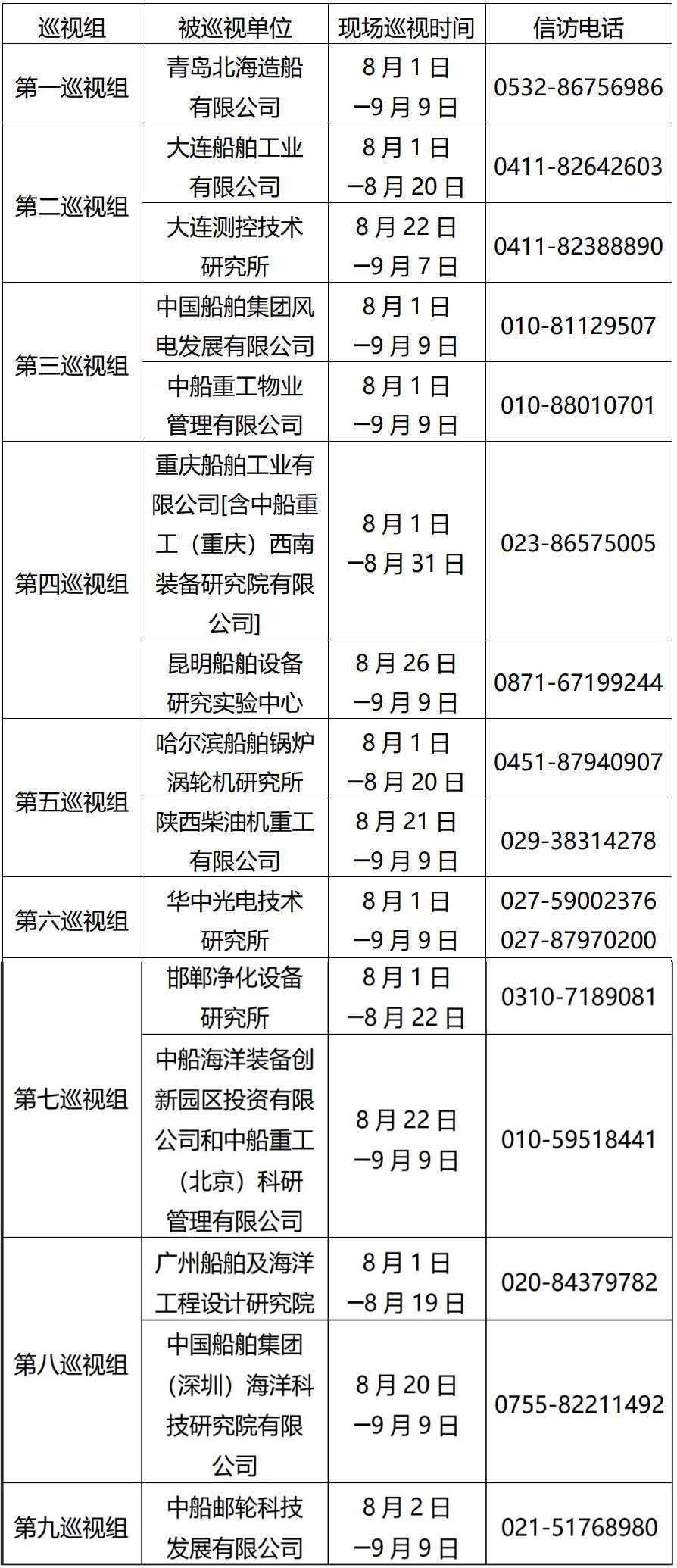 根據(jù)中國船舶集團黨組2022年第一輪巡視工作部署,截至2022年8月2日,中國船舶集團黨組9個巡視組已進駐青島北海造船有限公司、大連船舶工業(yè)有限公司、中國船舶集團風電發(fā)展有限公司、中船重工物業(yè)管理有限公司、重慶船舶工業(yè)有限公司[含中船重工(重慶)西南裝備研究院有限公司]、哈爾濱船舶鍋爐渦輪機研究所、華中光電技術(shù)研究所、邯鄲凈化設(shè)備研究所、廣州船舶及海洋工程設(shè)計研究院、中船郵輪科技發(fā)展有限公司等單位,對其黨組織開展為期40天左右的現(xiàn)場巡視。巡視期間,巡視組設(shè)置專門值班電話(具體如下表)。同時在巡視組工作現(xiàn)場設(shè)置聯(lián)系信箱,廣大干部職工可以反映情況。