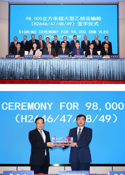 11月2日,中國船舶集團(tuán)旗下江南造船(集團(tuán))有限責(zé)任公司承建的,山東海洋集團(tuán)下屬太平洋氣體船4艘超大型乙烷運(yùn)輸船項(xiàng)目簽約儀式在上海舉行。中國船舶集團(tuán)黨組副書記、總經(jīng)理?xiàng)罱鸪?,黨組成員、副總經(jīng)理孫偉,山東海洋集團(tuán)黨委書記、董事長姜國棟,黨委委員、副總經(jīng)理于冰出席儀式。