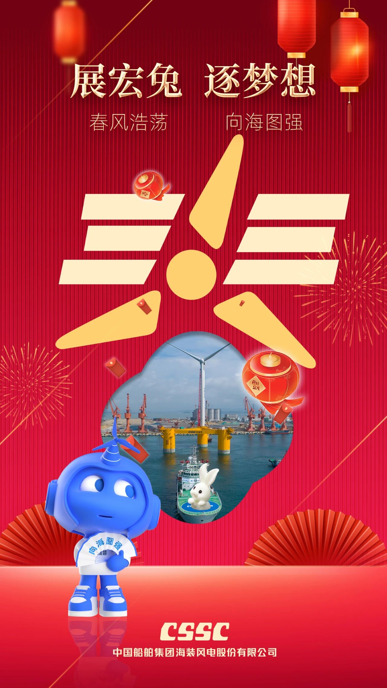 海報(bào)主體部分以國(guó)內(nèi)首臺(tái)深遠(yuǎn)海浮式風(fēng)電裝備“扶搖號(hào)”為創(chuàng)意點(diǎn),通過(guò)含有“大風(fēng)車”形象的寫(xiě)意“春”字,表達(dá)中船海裝將在春風(fēng)浩蕩中大展宏“兔”,在向海圖強(qiáng)征程中矢志奮斗!