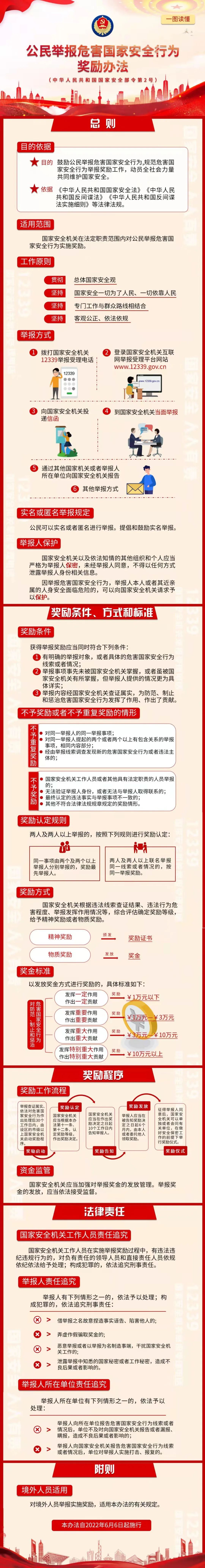 2022年6月6日,國(guó)家安全部公布部門規(guī)章《公民舉報(bào)危害國(guó)家安全行為獎(jiǎng)勵(lì)辦法》。國(guó)家安全一切為了人民,一切依靠人民,讓我們行動(dòng)起來(lái),共做國(guó)家安全的守護(hù)人!
