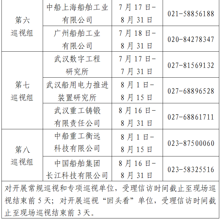 根據(jù)中國船舶集團(tuán)黨組2023年第一輪巡視工作部署,截至2023年7月17日,巡視工作已經(jīng)鋪開。其中,對(duì)中國船舶工業(yè)貿(mào)易有限公司、中國船舶集團(tuán)物資有限公司、江蘇自動(dòng)化研究所、河南柴油機(jī)重工有限責(zé)任公司、中國船舶集團(tuán)有限公司綜合技術(shù)經(jīng)濟(jì)研究院、船舶信息研究中心、中國船舶集團(tuán)國際工程有限公司等7家單位開展常規(guī)巡視,對(duì)中船上海船舶工業(yè)有限公司、廣州船舶工業(yè)有限公司等2家單位開展專項(xiàng)巡視,對(duì)武漢數(shù)字工程研究所、武漢船用電力推進(jìn)裝置研究所、武漢重工鑄鍛有限責(zé)任公司、中國船舶集團(tuán)長江科技有限公司、中船重工衡遠(yuǎn)科技有限公司等5家單位開展巡視“回頭看”。