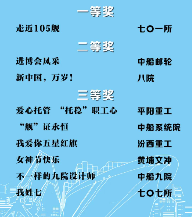 由中國(guó)船舶集團(tuán)黨群工作部指導(dǎo),中國(guó)船舶集團(tuán)新聞宣傳中心/中國(guó)船舶報(bào)社承辦的中國(guó)船舶集團(tuán)第二屆短視頻大賽圓滿落幕。經(jīng)過(guò)前期篩選,網(wǎng)絡(luò)投票,并特邀國(guó)務(wù)院國(guó)資委新聞中心、國(guó)防科工局新聞宣傳中心、中央電視臺(tái)、微博政務(wù)、中國(guó)船舶集團(tuán)黨群工作部專家評(píng)審,大賽最終評(píng)出一等獎(jiǎng)5部,二等獎(jiǎng)10部,三等獎(jiǎng)23部,同時(shí)評(píng)出優(yōu)秀組織獎(jiǎng)單位6家。名單如下,快來(lái)圍觀!