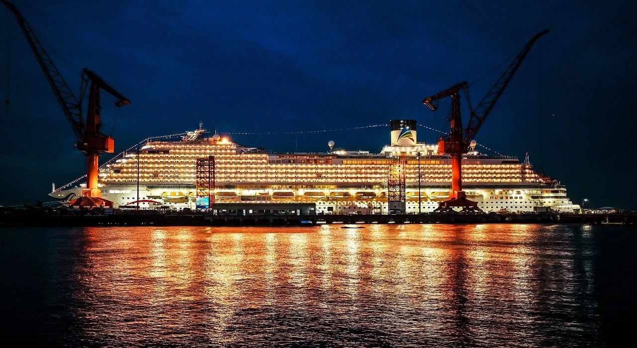 國產首艘國產大型郵輪“愛達·魔都號”,??吭陂L江口,燈光電路測試期間,華燈綻放恍如白晝。