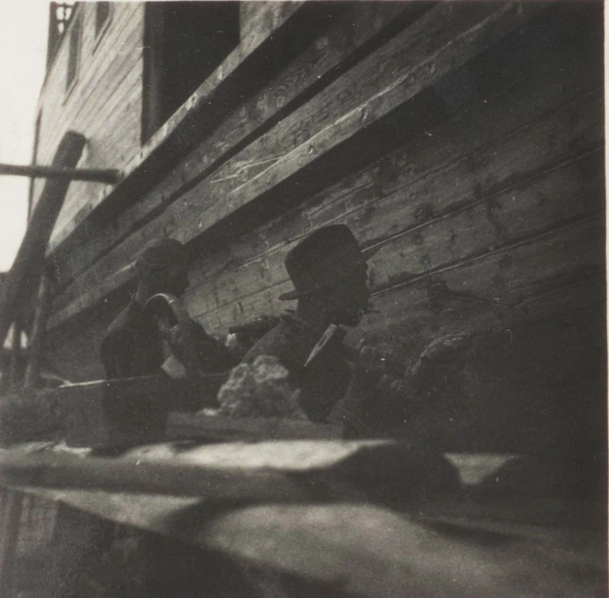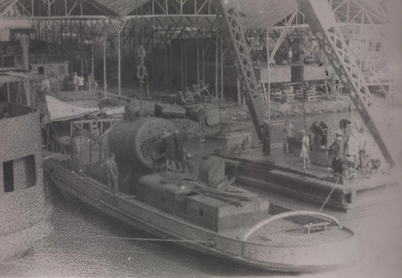 1934年武漢,上世紀(jì)30年代,武昌造船成立之初,工人們以手工作業(yè)“敲敲打打”形式開(kāi)展修造船業(yè)務(wù)。修造的船只大多為100~300噸、鋼肋骨與木殼結(jié)構(gòu),僅有少量是鋼鉚接船體。建造的船只只能在長(zhǎng)江上航行跑跑運(yùn)輸。為了生存和救國(guó),船廠(chǎng)還建造一些農(nóng)用機(jī)械器具、槍支,以輔助民生、支援抗日。