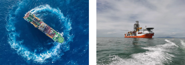 # 通過配置最先進(jìn)的DP-3級(jí)動(dòng)力定位系統(tǒng),自動(dòng)調(diào)整船舶底部7臺(tái)推進(jìn)器的轉(zhuǎn)向和推力大小,來抵抗海上風(fēng)、浪、流作用在船上的載荷,使船舶在海上保持一定的水平位置;