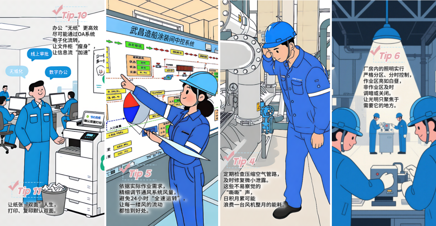 武昌造船在節(jié)能宣傳周期間組織開展了“船廠節(jié)能秘籍”征集活動,以船廠員工的一天為軸線,收集到各類節(jié)能基本操作,形成了《這些基本操作,我知道你一定能做到》宣傳材料,并通過公司公眾號發(fā)布,向員工普及節(jié)能知識與技巧,擴(kuò)大節(jié)能宣傳覆蓋面。同時(shí)開展 “停用空調(diào)”能源緊缺體驗(yàn)行動,倡議全體員工在全國低碳日,關(guān)閉辦公室、會議室及非必要區(qū)域空調(diào)設(shè)備,通過實(shí)際行動感受能源緊缺,踐行節(jié)能理念,進(jìn)一步增強(qiáng)員工資源憂患意識。