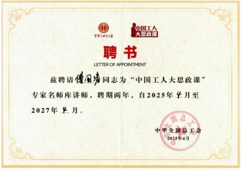 近日,中華全國總工會正式聘請中船集團(tuán)重慶紅江傅國濤為“中國工人大思政課”專家名師庫講師,聘期兩年。這一聘任旨在推動“大思政課”建設(shè)走深走實,發(fā)揮優(yōu)秀人才在思想政治教育中的示范引領(lǐng)作用。