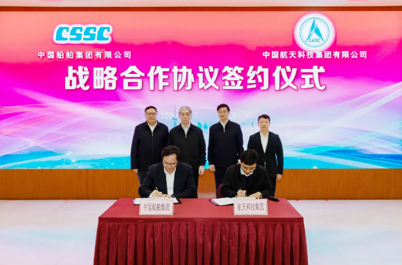 12月7日,中國(guó)船舶集團(tuán)有限公司與中國(guó)航天科技集團(tuán)有限公司在京簽署戰(zhàn)略合作協(xié)議。中國(guó)船舶集團(tuán)黨組書記、董事長(zhǎng)雷凡培,黨組副書記、總經(jīng)理?xiàng)罱鸪?,黨組成員、副總經(jīng)理錢建平,航天科技集團(tuán)黨組書記、董事長(zhǎng)吳燕生,黨組副書記、總經(jīng)理徐強(qiáng),黨組成員、副總經(jīng)理張忠陽(yáng)出席簽約儀式。楊金成、徐強(qiáng)分別代表雙方在協(xié)議上簽字。