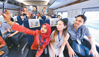 6月17日,100余名留學(xué)生從西安出發(fā),乘坐寶蘭高鐵試運(yùn)行動(dòng)車組前往蘭州,初次體驗(yàn)即將開通運(yùn)營(yíng)的首條貫通新絲路高鐵。圖為幾名外國(guó)留學(xué)生在動(dòng)車組試驗(yàn)列車上自拍。唐振江攝(人民視覺)