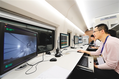 6月20日,西(安)成(都)高鐵陜西段聯(lián)調(diào)聯(lián)試正式啟動(dòng)。圖為當(dāng)高速綜合檢測(cè)列車穿越秦嶺時(shí),技術(shù)人員在監(jiān)測(cè)列車運(yùn)行數(shù)據(jù)。新華社記者 李一博攝