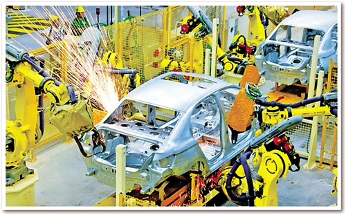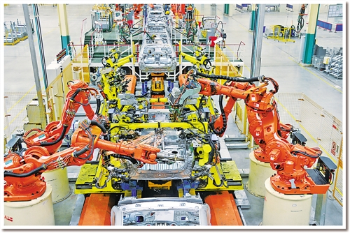 日前,記者在東風(fēng)汽車公司旗下神龍汽車公司成都工廠焊裝車間看到,占地面積約10個足球場的車間儼然就是一個“機(jī)器人王國”:442臺各種機(jī)器人都在忙碌著,所有點(diǎn)焊、弧焊、激光焊、螺柱焊、涂膠、包邊、鉚接、部件搬運(yùn)等“重活、累活”全部由機(jī)器人自動完成。焊裝分廠廠長孫繼勝介紹說,除442臺機(jī)器人外,車間還有另外一個“撒手锏”??六面體轉(zhuǎn)臺設(shè)備。“原來生產(chǎn)1個車型要建6條生產(chǎn)線,現(xiàn)在1條生產(chǎn)線就可以生產(chǎn)6種車型。”孫繼勝說。