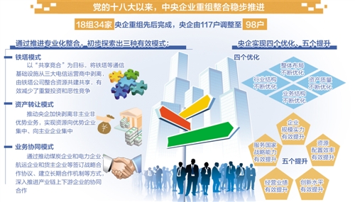 5年來,央企重組著力推進強強聯(lián)合,穩(wěn)妥推進裝備制造、電力、鋼鐵、航運、建材、旅游等領域企業(yè)重組,更好發(fā)揮協(xié)同效應,實現(xiàn)優(yōu)化提升。尤其是專業(yè)化整合成效顯著,初步探索出鐵塔模式、資產(chǎn)轉(zhuǎn)讓模式、業(yè)務協(xié)同模式等3種有效模式??