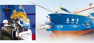 “船上鋼樁臺車安裝了4個大油缸,單個就達(dá)38噸,所有安裝誤差都只有0.2毫米”,安裝輪機車間主任沙勝紅說,“考驗還在繼續(xù)”。輪機車間的工人全部是訓(xùn)練有素的技術(shù)員工,他們克服了難以想象的困難,硬是拿下全船高難度的設(shè)備安裝工作,質(zhì)量贏得船東、船檢的一致好評。