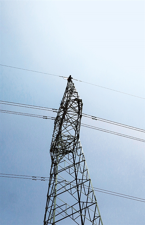 一名電工爬上一座電網(wǎng)塔基進(jìn)行檢修。這條331公里的輸電線(xiàn)路是新疆東南部且末縣和若羌縣10萬(wàn)多居民用電的主要憑借。
