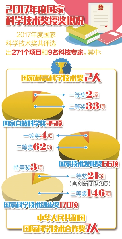 1月8日,2017年度國家科學(xué)技術(shù)獎勵大會在北京人民大會堂隆重舉行。2名科學(xué)家獲得國家最高科學(xué)技術(shù)獎,271個項目獲得國家自然科學(xué)獎、國家技術(shù)發(fā)明獎、國家科學(xué)技術(shù)進步獎三大獎,7名外籍專家獲得國際合作獎。