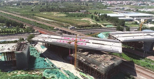 ????該工程上跨鄭焦城際、京廣鐵路等3條線5股道,每天有140對(duì)高鐵列車和貨運(yùn)列車擦肩而過,轉(zhuǎn)體橋與鐵路線的最近距離只有8.7米,加上該工程橋梁全長(zhǎng)317米,寬38.7米,轉(zhuǎn)體懸臂長(zhǎng)71.75米,單側(cè)轉(zhuǎn)體橋梁重達(dá)3萬噸,鐵路東、西兩側(cè)轉(zhuǎn)體橋梁總重達(dá)6萬噸,體量大,風(fēng)險(xiǎn)高,施工難度可想而知。為確保總重量達(dá)6萬噸的轉(zhuǎn)體橋精準(zhǔn)對(duì)接,重點(diǎn)在于球鉸的制作、安裝,轉(zhuǎn)體過程中應(yīng)力應(yīng)變、位移與線性的實(shí)時(shí)監(jiān)測(cè)。本次成功應(yīng)用的轉(zhuǎn)動(dòng)體系采用鋼球鉸,由雙瑞特裝設(shè)計(jì)、制造、安裝及轉(zhuǎn)體施工,解決了大噸位橋梁轉(zhuǎn)體裝置超大承載力,靈活轉(zhuǎn)動(dòng)的難題。