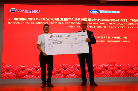 10月25日,廣船國(guó)際有限公司為VISTA公司建造的7.5萬(wàn)噸化學(xué)品/成品油船4號(hào)船命名交付。這是廣船國(guó)際在“決戰(zhàn)120天,掀起生產(chǎn)高潮”勞動(dòng)競(jìng)賽中收獲的又一枚勝利果實(shí)。該船比合同交船期提前43天交付,船東為此專門獎(jiǎng)勵(lì)廣船國(guó)際1萬(wàn)美元。