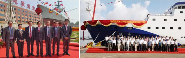 以上左圖:馬來西亞瀕海任務(wù)艦首艦“KERIS”號下水;右圖:“大洋號”綜合資源調(diào)查船交船儀式。