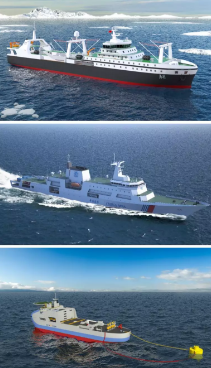 圖1:南極磷蝦捕撈加工船效果圖;圖2:首艘萬噸級海事巡邏船效果圖;圖3:首個(gè)民用涉核總體設(shè)計(jì)項(xiàng)目效果圖。
