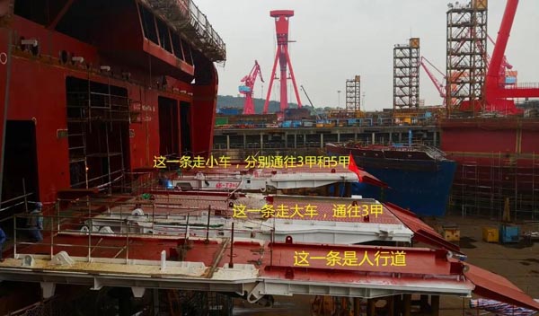 其次,大車停在3甲車庫(kù),小車停在5甲車庫(kù),可使船舶的重心會(huì)更低、整體更穩(wěn),最重要的是還考慮到港口條件進(jìn)行了量身定做。