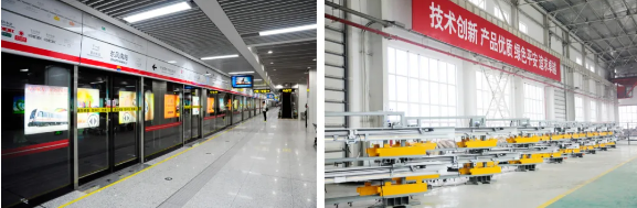 左圖:鄭州地鐵1號線使用七一三所軌道交通站臺門系統(tǒng);右圖:七一三所軌道交通站臺門門機系統(tǒng)生產現場