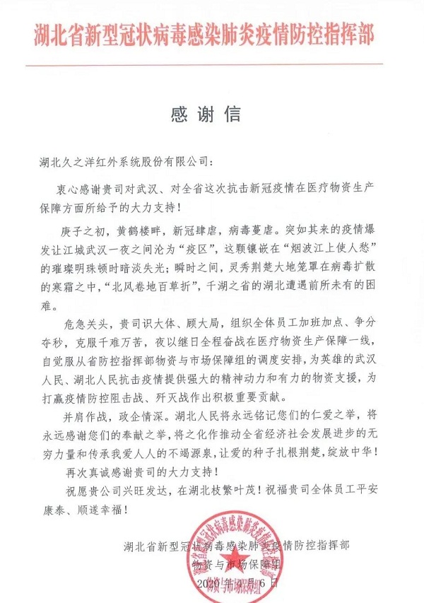 ????信中,對(duì)中國船舶集團(tuán)七一七所所屬湖北久之洋紅外系統(tǒng)股份有限公司在抗擊新冠肺炎疫情工作中,在醫(yī)療物資生產(chǎn)保障方面給予的大力支持表示感謝。