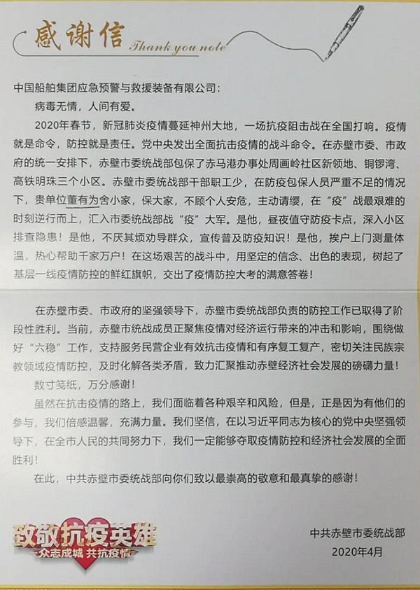 ????中共赤壁市委統(tǒng)戰(zhàn)部特向中國船舶集團(tuán)旗下中國應(yīng)急發(fā)來感謝信,對(duì)中國應(yīng)急員工董有為舍小家保大家,不顧個(gè)人安危,主動(dòng)請(qǐng)纓,在戰(zhàn)“疫”最艱難的時(shí)刻逆行而上表示感謝和致敬。