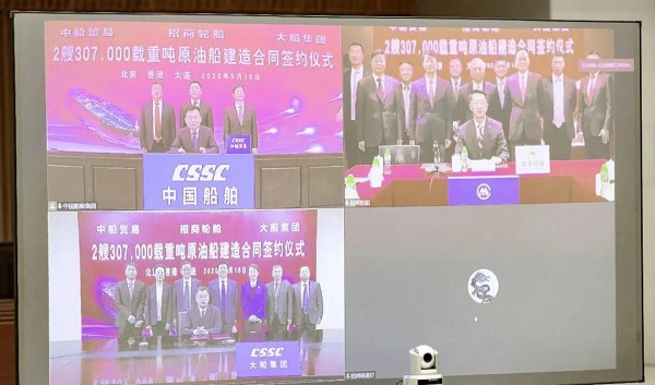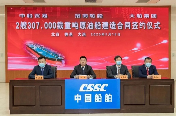 ????5月18日,中國(guó)船舶集團(tuán)旗下大船集團(tuán)、中船貿(mào)易與招商局集團(tuán)旗下招商輪船在北京、大連、香港三地以“云簽約”方式簽署2艘30.7萬載重噸原油船建造合同。中國(guó)船舶集團(tuán)副總經(jīng)理孫偉、招商局集團(tuán)副總經(jīng)理王宏、招商輪船董事長(zhǎng)謝春林出席簽約儀式,中船貿(mào)易董事長(zhǎng)李洪濤、大船集團(tuán)總經(jīng)理?xiàng)钪局?、招商輪船總?jīng)理王永新代表各方在建造合同上簽字。
