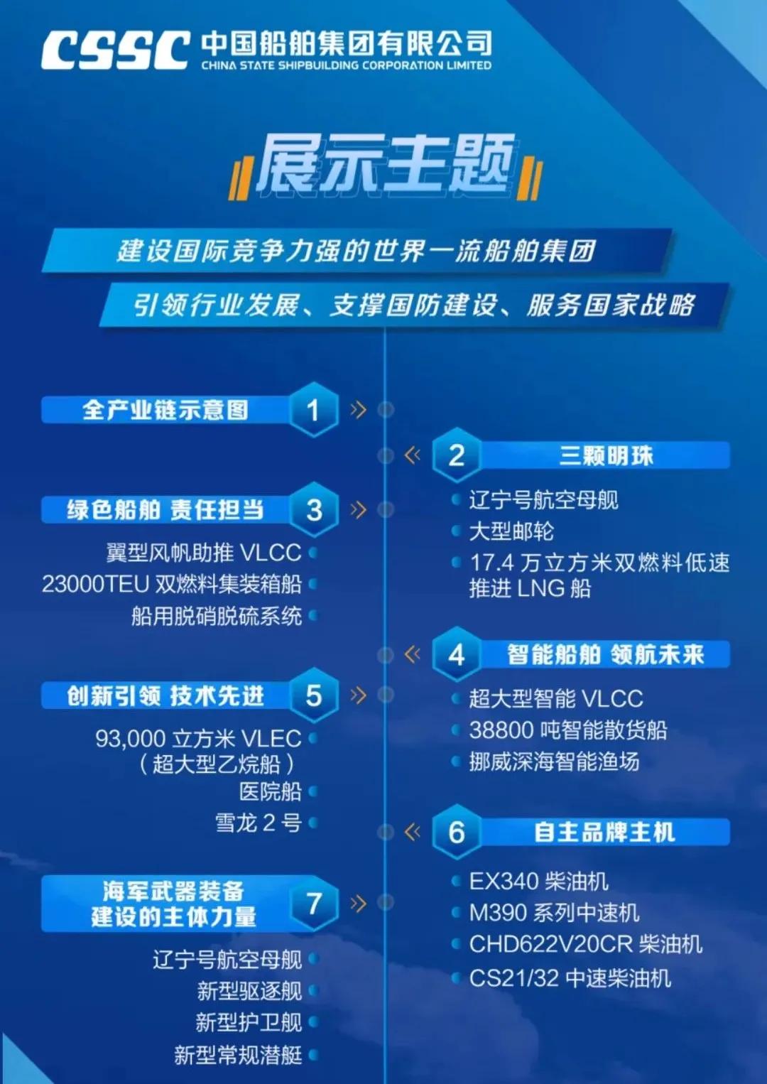 船舶海工裝備產(chǎn)業(yè)展區(qū) 分為船舶與海洋工程、船舶配套2個大區(qū),整體展示了中國船舶集團(tuán)強(qiáng)大的船舶建造能力。船舶與海洋工程分為海洋運輸與工程裝備,海洋資源開發(fā)、海洋科考裝備,海洋漁業(yè),新開發(fā)船型與船舶改裝等六大板塊;船舶配套區(qū)包括動力與配套、機(jī)電裝備和電子信息裝備3大部分,共展出模型及實物68個,重點聚焦自主品牌、系列化產(chǎn)品及國際領(lǐng)先產(chǎn)品,展示了中國船舶集團(tuán)在業(yè)界最為完整齊全的船舶動力機(jī)電配套產(chǎn)業(yè)鏈,具備提供穩(wěn)定、可靠的全動力和配套解決方案的能力。