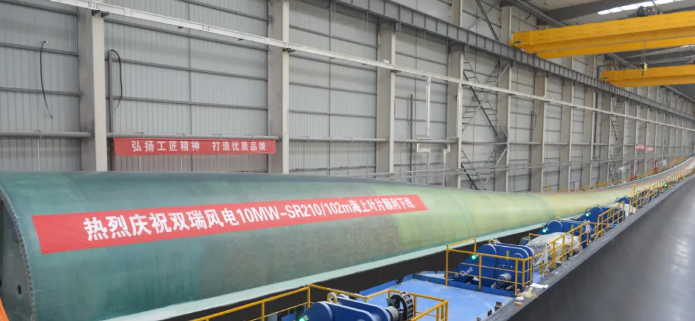 2月8日,在中國船舶集團七二五所雙瑞風電江蘇鹽城基地,國內(nèi)第一支長度超過100米的風電葉片下線。這支由雙瑞風電自主研發(fā)的10MW-SR210型葉片,長度達102米,是目前世界上最長的10MW風電葉片。