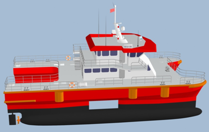 本次簽訂的合同包含兩艘新型單體引航船和一艘雙體引航船。單體引航船總長21.88米、型寬6米、型深2.85米、吃水1.30米,可搭載6名引航員及5名船員,設計航速不小于21.2節(jié)。雙體引航船為國內(nèi)首創(chuàng),船舶總長27.5米、型寬13.60米、型深5.70米、吃水2.70米,可搭載9名引航員及6名船員,設計航速不小于18節(jié)。
