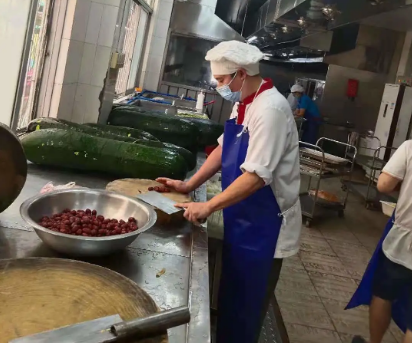 而在技校和養(yǎng)老院的后廚,阮積劍等廚師們同樣已經(jīng)整裝待發(fā)。在社區(qū)封閉初期,飲食服務(wù)部養(yǎng)老院飯?zhí)脝T工由原來的18人劇減至7人。廚師梁志寬面對(duì)每日約800人的進(jìn)餐人數(shù),迎難而上,轉(zhuǎn)變菜式花樣,合理優(yōu)化膳食,注重營養(yǎng)搭配,以嫻熟的廚藝獨(dú)自完成后廚大量工作,保證了菜肴準(zhǔn)時(shí)出品。而廚師、黨員陳兆銘得知飯?zhí)靡蚴芤咔橛绊懚耸謬?yán)重不足,在試航歸來做完核酸檢測(cè)后立即回到養(yǎng)老院飯?zhí)玫膷徫簧?。為此,他直接把“家”安在了養(yǎng)老院,每天睡在簡易折疊床上。