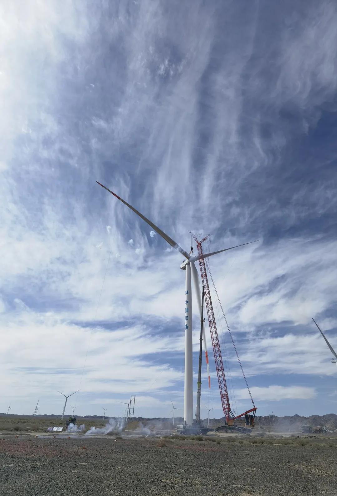 該項目于4月12日啟動首臺機組吊裝,中國海裝項目人員提前制訂吊裝調試方案及安全預案,采取“邊吊裝邊調試”的方式加快整體工程進度,克服戈壁灘高溫天氣和疫情反復等困難,于7月10日實現(xiàn)首批100MW實現(xiàn)全容量并網,8月20日實現(xiàn)59臺機組全部吊裝。