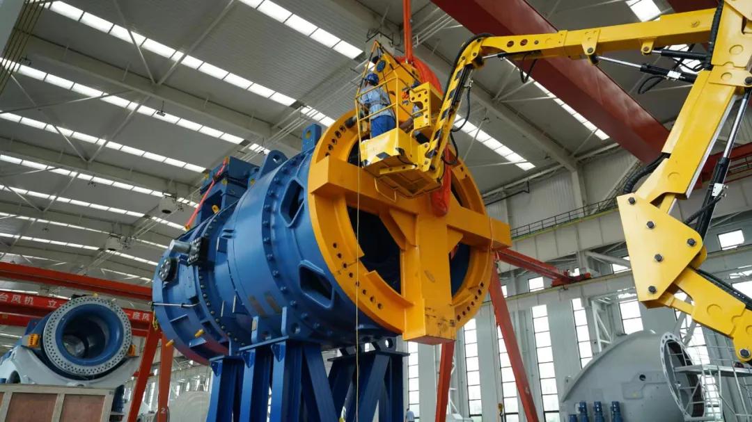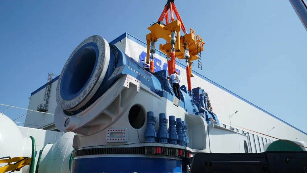 中國(guó)海裝工人在吊裝H210-10兆瓦機(jī)組傳動(dòng)鏈