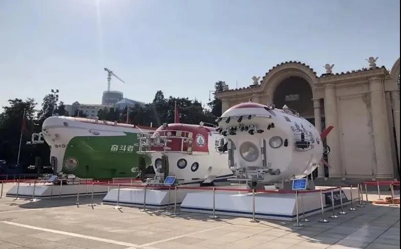 屹立展館外場的“蛟龍”號、“深海勇士”號、“奮斗者”號三臺實尺度潛水器模型。