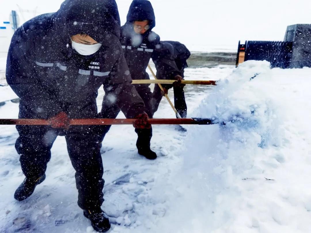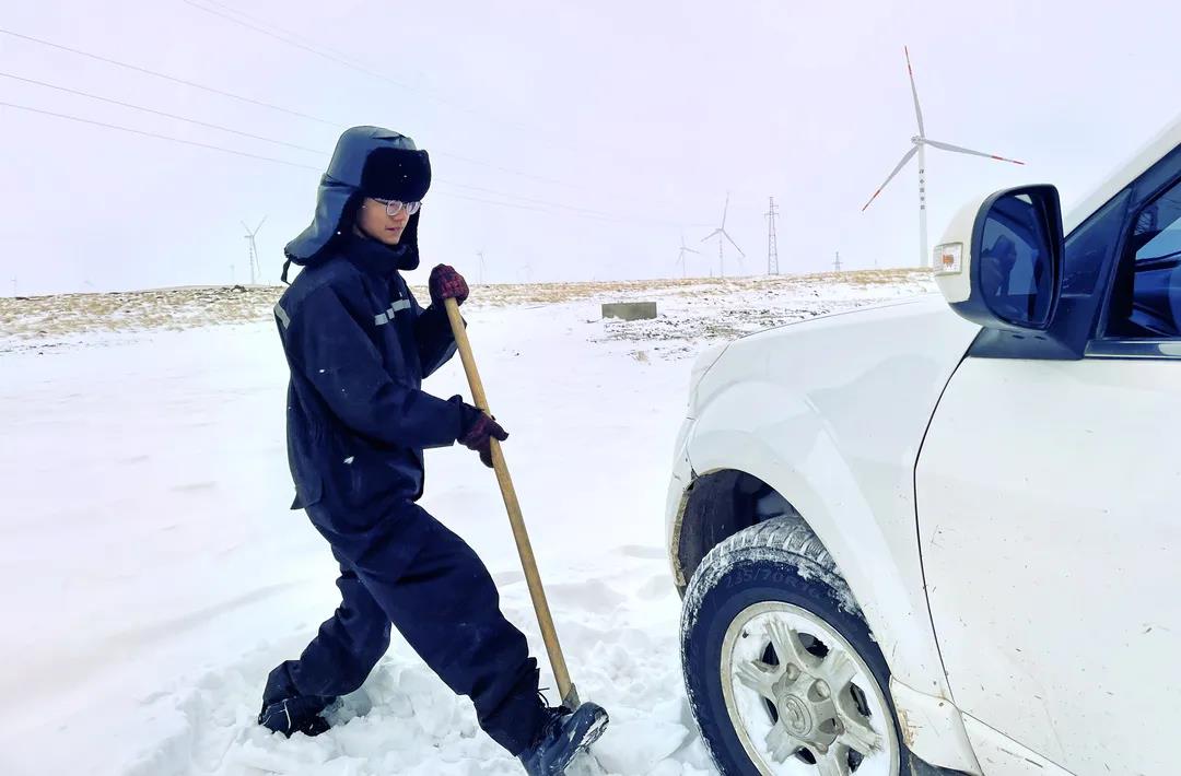進(jìn)入11月,內(nèi)蒙古自治區(qū)錫林郭勒盟地區(qū)迎來大面積的暴風(fēng)雪,烏達(dá)萊項(xiàng)目人員在趕往風(fēng)場的路上遭遇積雪路段,雖然氣候嚴(yán)寒,但為了及時消除機(jī)組故障,大家在積雪路段采取挖雪推車的方式齊心協(xié)力,一同開展清理路面積雪的行動。這個冬日,冰雪阻擋不住海裝追風(fēng)者們勇往直前的步伐,他們只為恪盡職守完成一個承諾——風(fēng)機(jī)旋轉(zhuǎn)、帶來光熱。