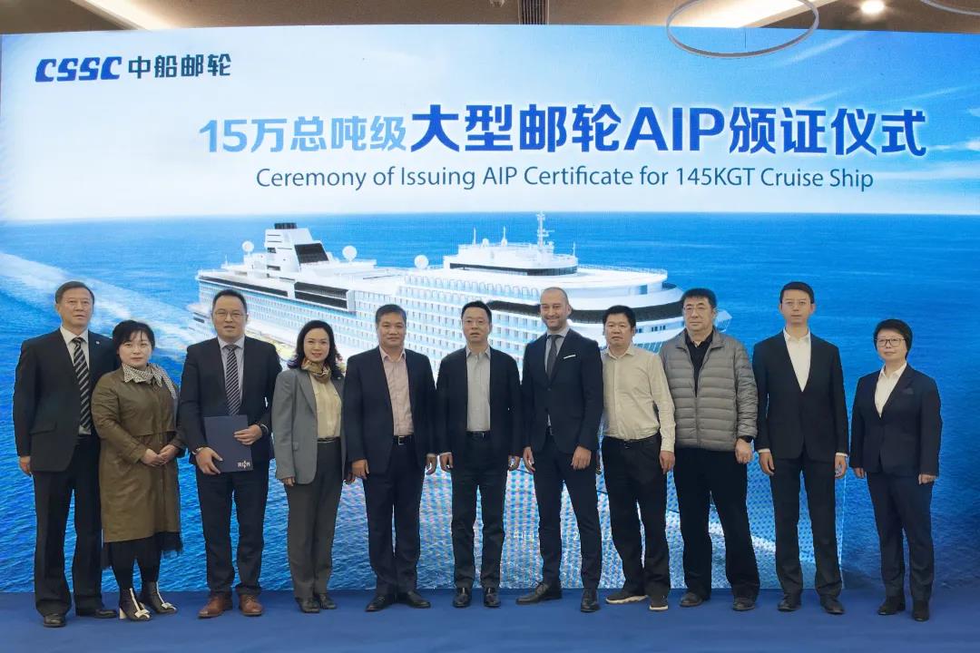 12月9日,中國船舶集團旗下中船郵輪自主研發(fā)設(shè)計的15萬總噸級大型郵輪獲得意大利船級社原則性認可(AIP)證書。這是中國首次獨立自主研發(fā)設(shè)計的完全擁有自主知識產(chǎn)權(quán)的大型郵輪,一舉打破國外在該領(lǐng)域長期技術(shù)封鎖和壟斷,開啟中國大型郵輪自主設(shè)計新時代。中國船舶集團黨組成員、副總經(jīng)理盛紀(jì)綱出席授證儀式并講話。