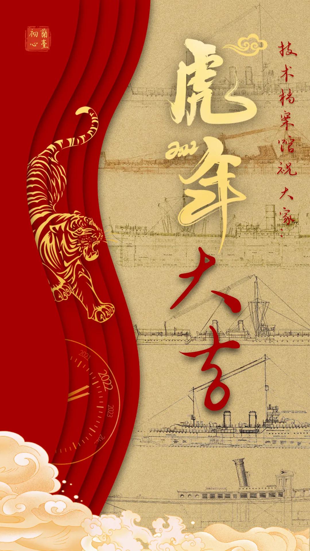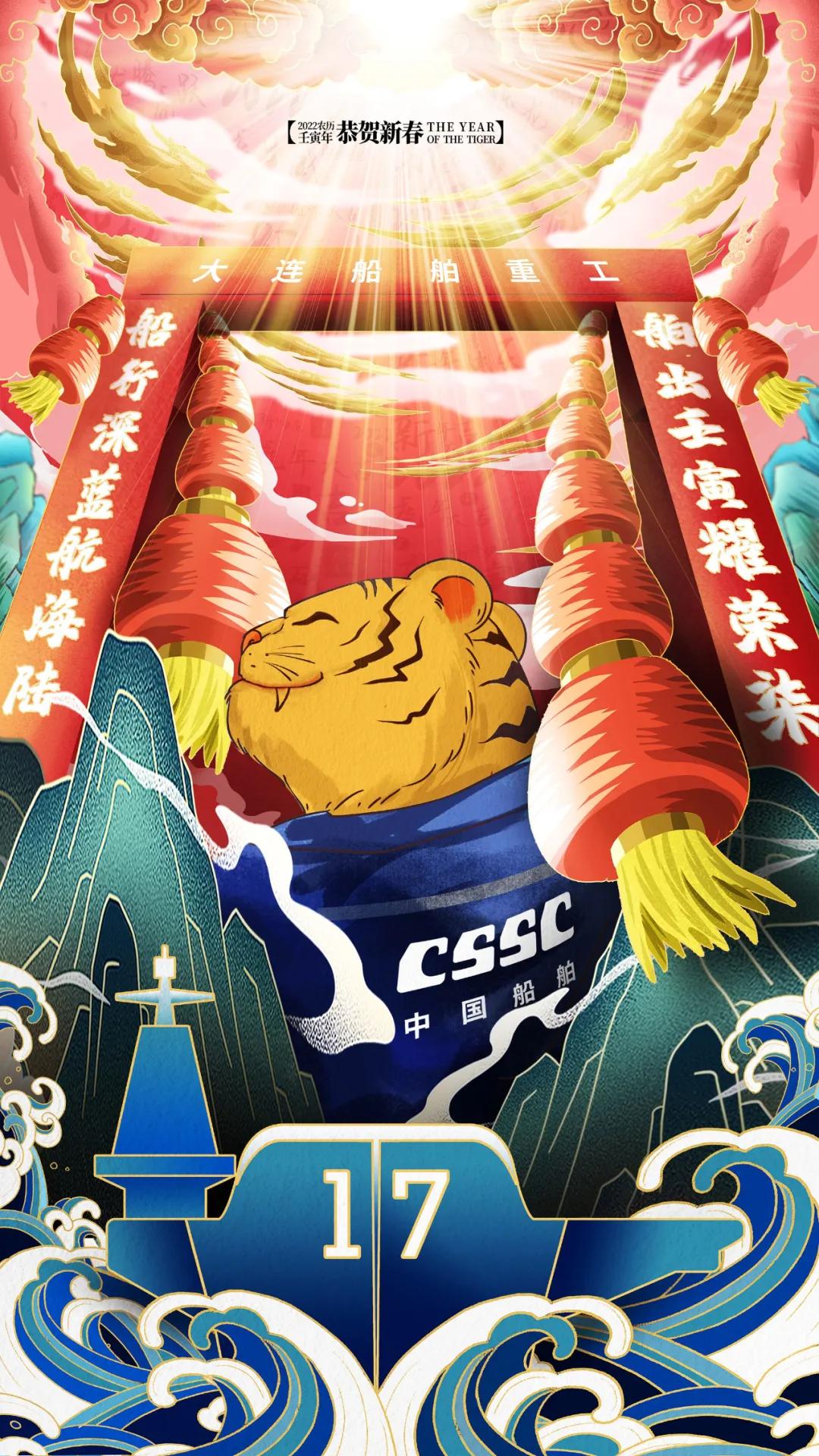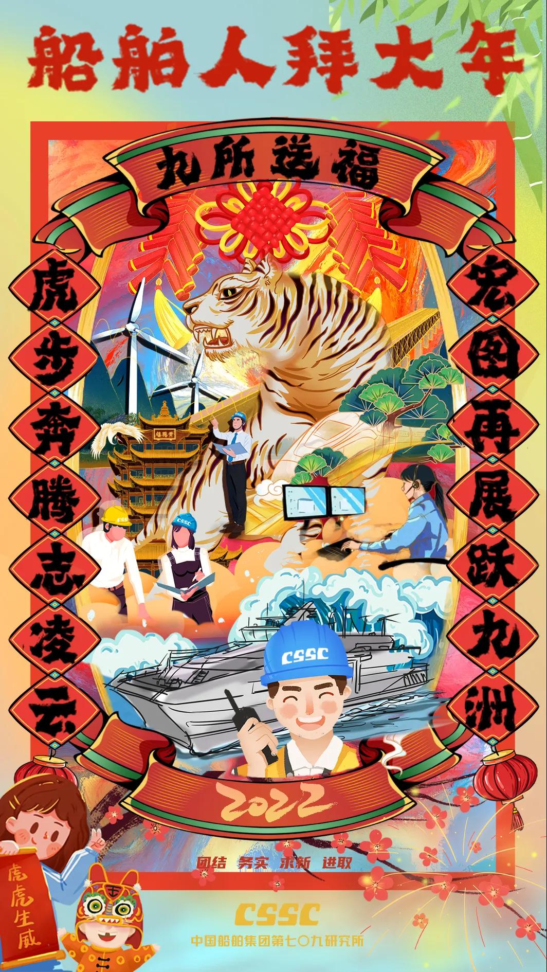 海報(bào)采用國潮畫風(fēng),中間部分“江小南”穿著新衣舉著虎頭,寓意新的一年中國船舶人虎虎生威,上面部分以重要產(chǎn)品和廠區(qū)設(shè)備為主,詮釋江南造船建造國之重器的初心和使命,同時(shí)輔以鞭炮、煙花、燈籠等新年元素,使海報(bào)充滿喜慶祥和的新年氛圍。